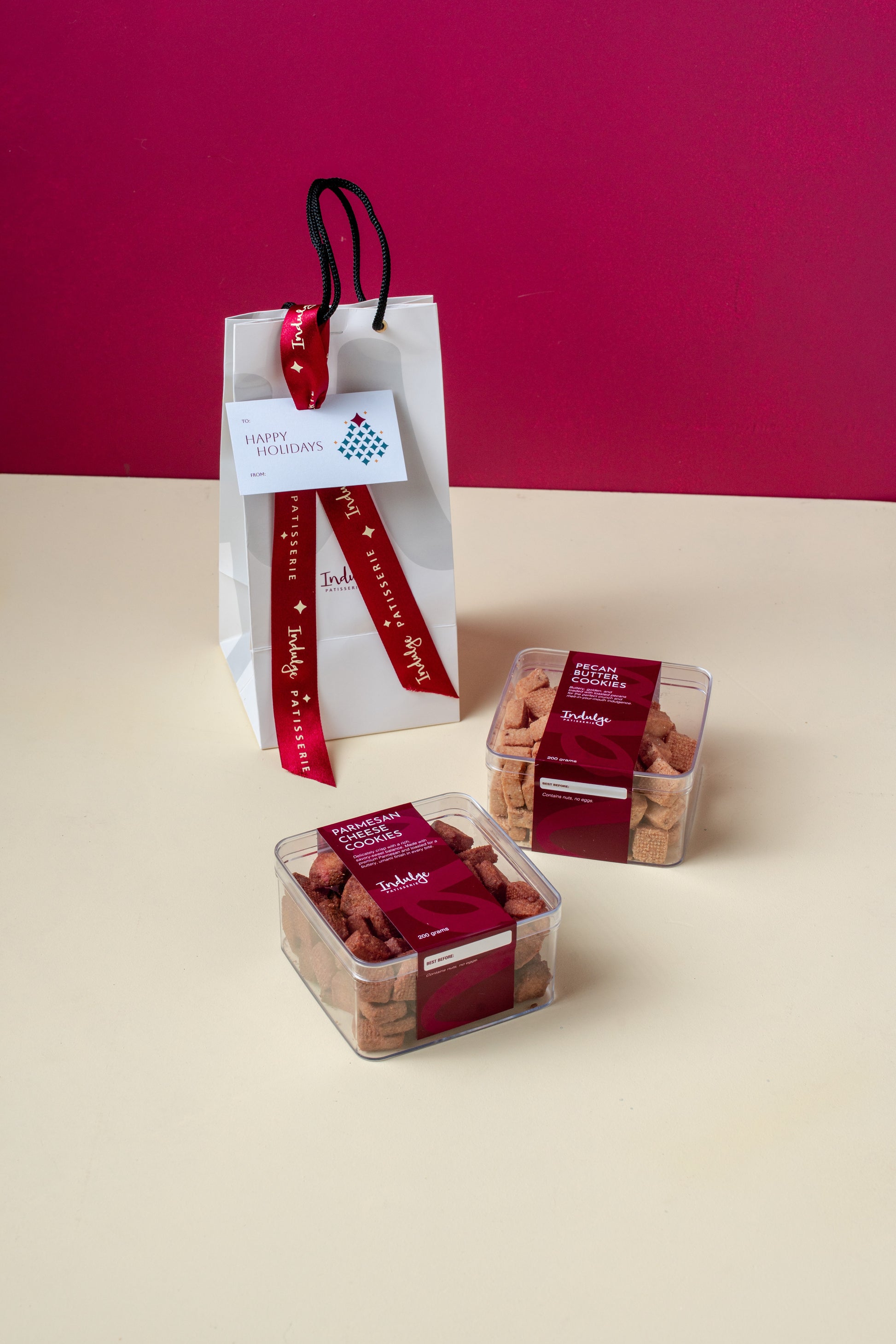 Perfect for gifting or personal indulgence, these cookies come in an acrylic cookie tub — available on its own or paired as a duo with our parmesan cheese cookies in an elegant Indulge gift bag.