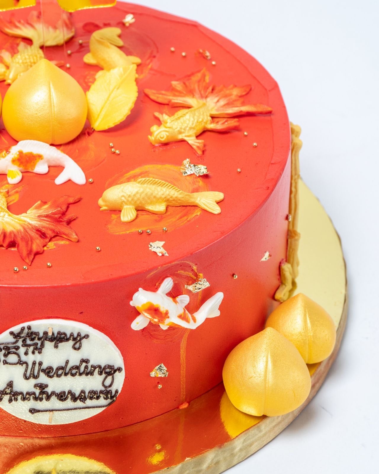 These cakes are decorated with gold or pink long life peaches, koi fish, bamboo and gold embellishments. Cake flavor can be mocha caramel, chocolate, vanilla caramel or vanilla lemon.